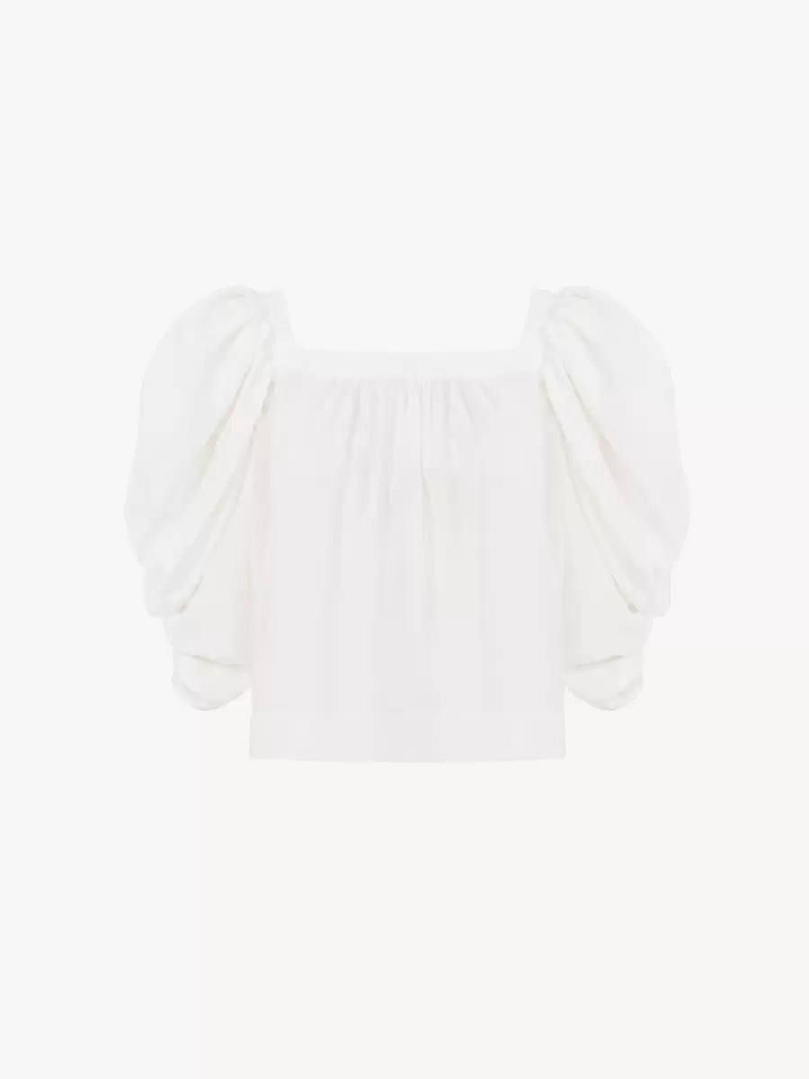 Puff-sleeve pleated top in silk poplin with a square neckline and a fluid silhouette.