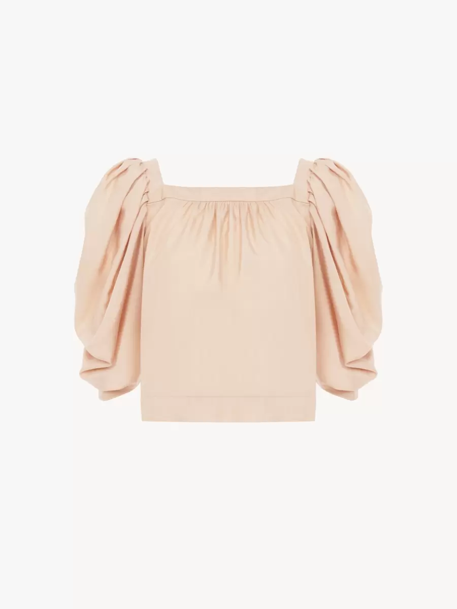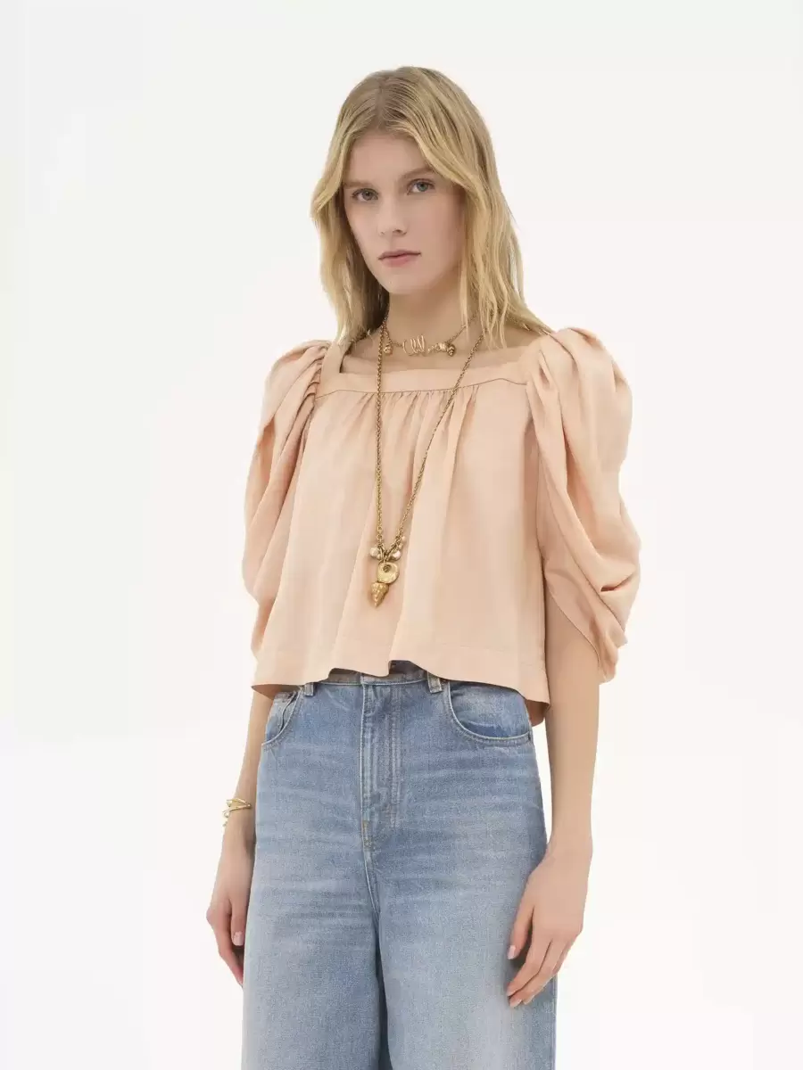 Puff-sleeve pleated top in silk poplin with a square neckline and a fluid silhouette.