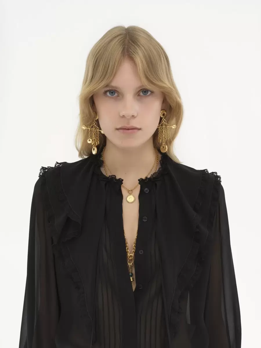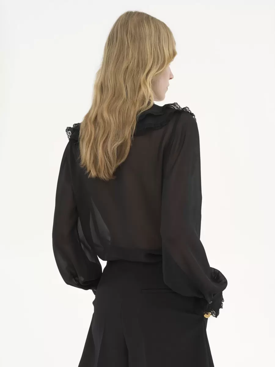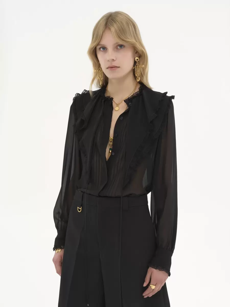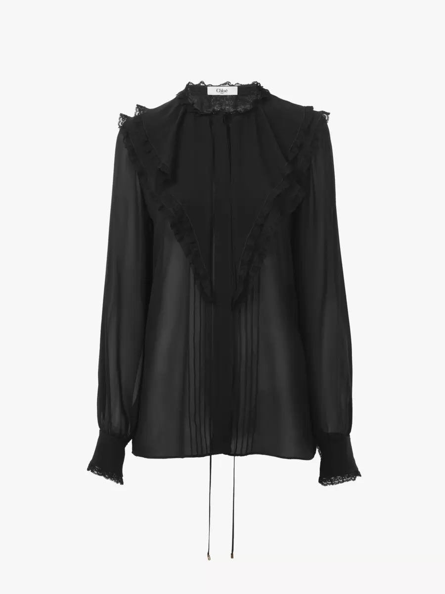 Fluid ruffled blouse in silk georgette, featuring a scalloped flower lace trim, pintucks down the front and dangling ties finished with gold-toned metal tips.