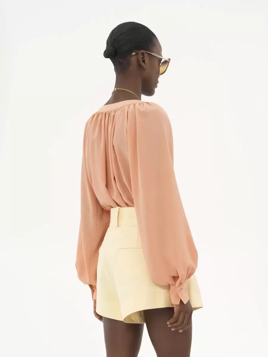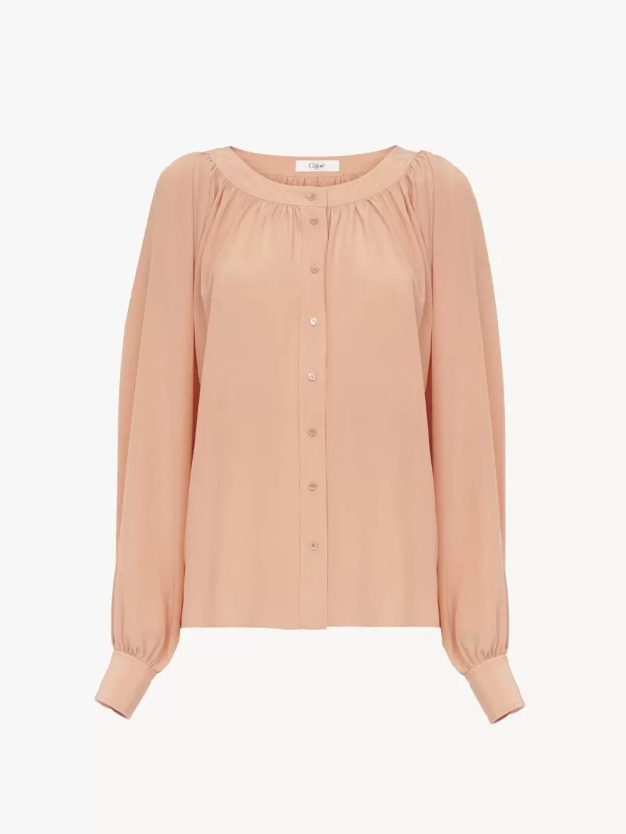 Fluid gathered scoop-neck blouse in organic silk crêpe de chine with puff sleeves and mother-of-pearl buttons.