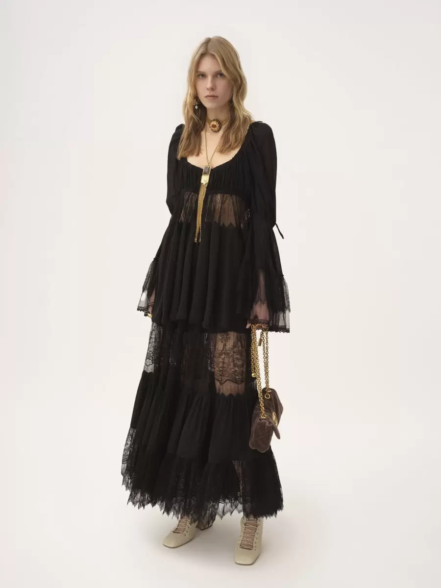 This product was made by Marie Helene Couture, a long-standing partner of Chloé based in Morlaas, France. Marie Helene Couture excels in the specialized technique of couture “flou.” Their expertise aligns with the rigorous standards set by the “métiers de la mode, vêtement flou” certification, ensuring a high level of professional aptitude in this delicate and skilled art form.