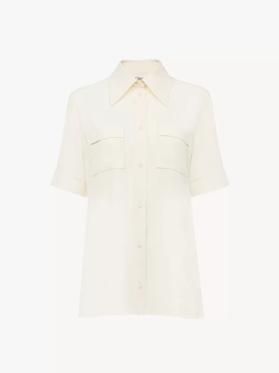 Collared short-sleeve blouse in organic silk crêpe de chine, featuring front patch pockets and mother-of-pearl buttons.