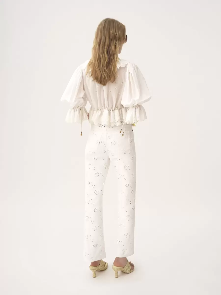 Ruffle top in organic cotton voile with floral broderie anglaise, a deep V-neck, flouncy trims and dangling ties with gold-tone metal tips and pineapple charms.