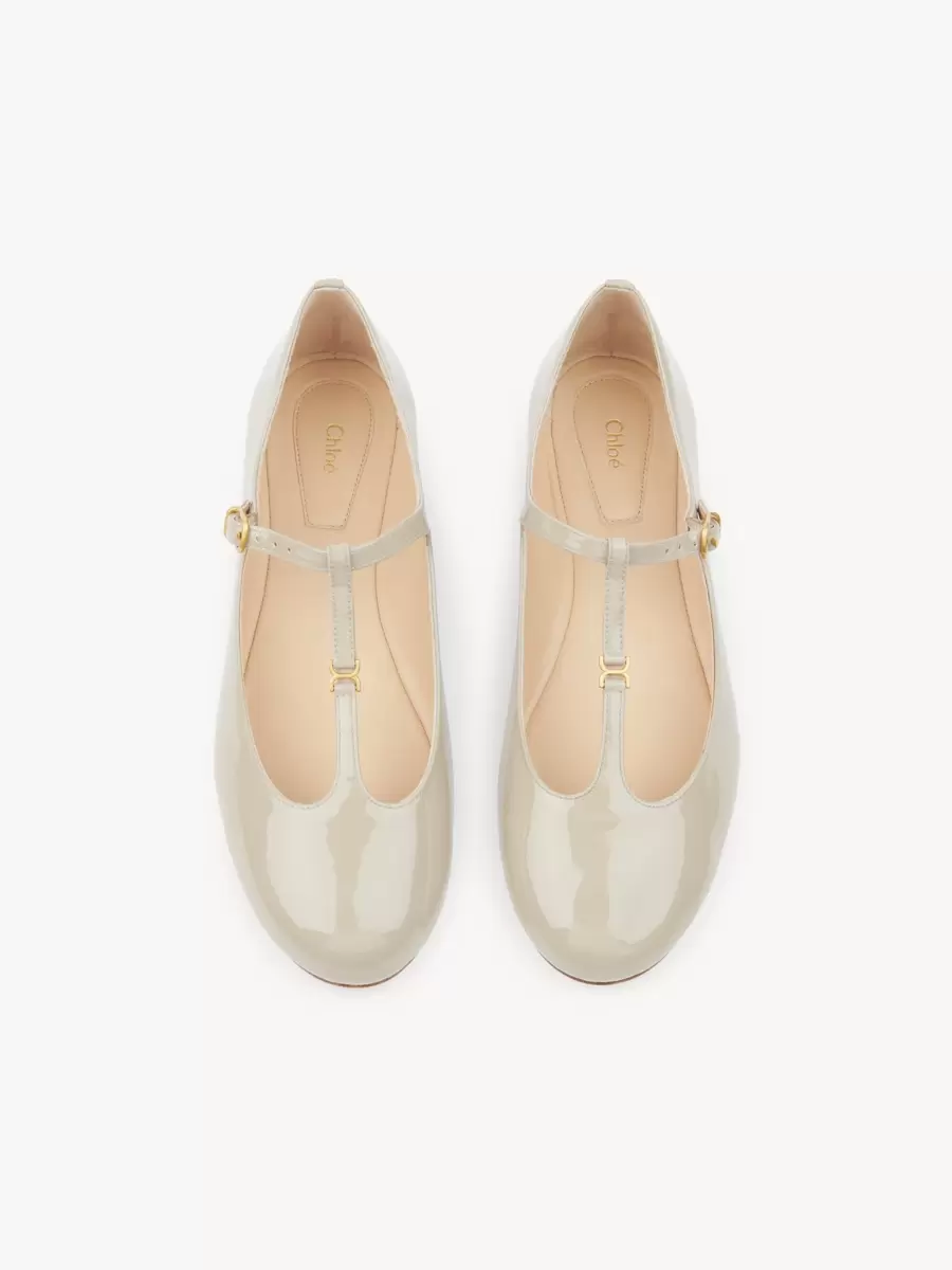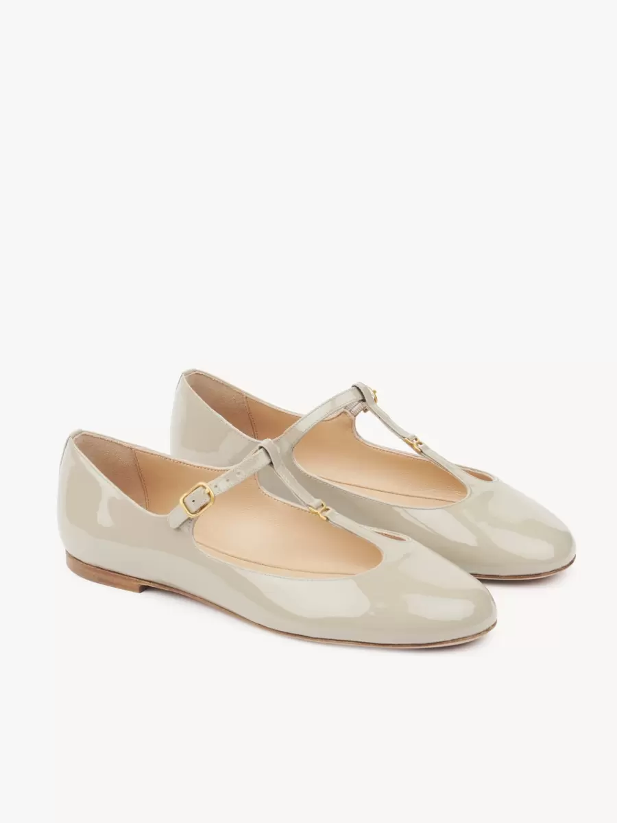 Crafted from patent calfskin, this revisited Marcie ballerina pairs a Mary Jane silhouette with an almond toe shape.