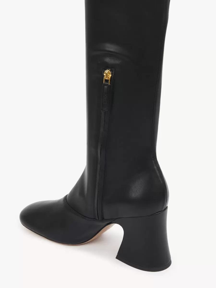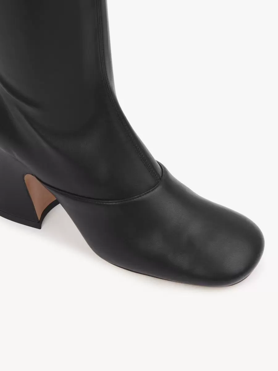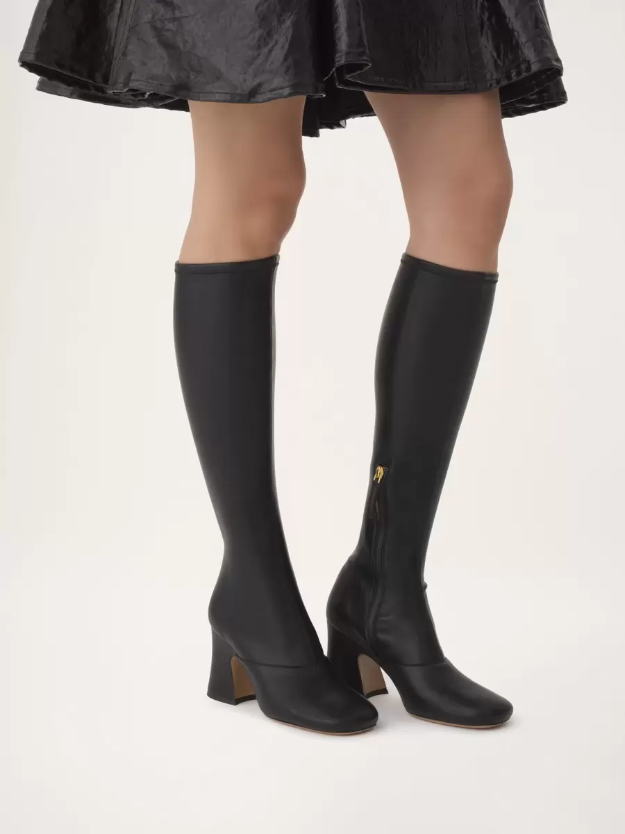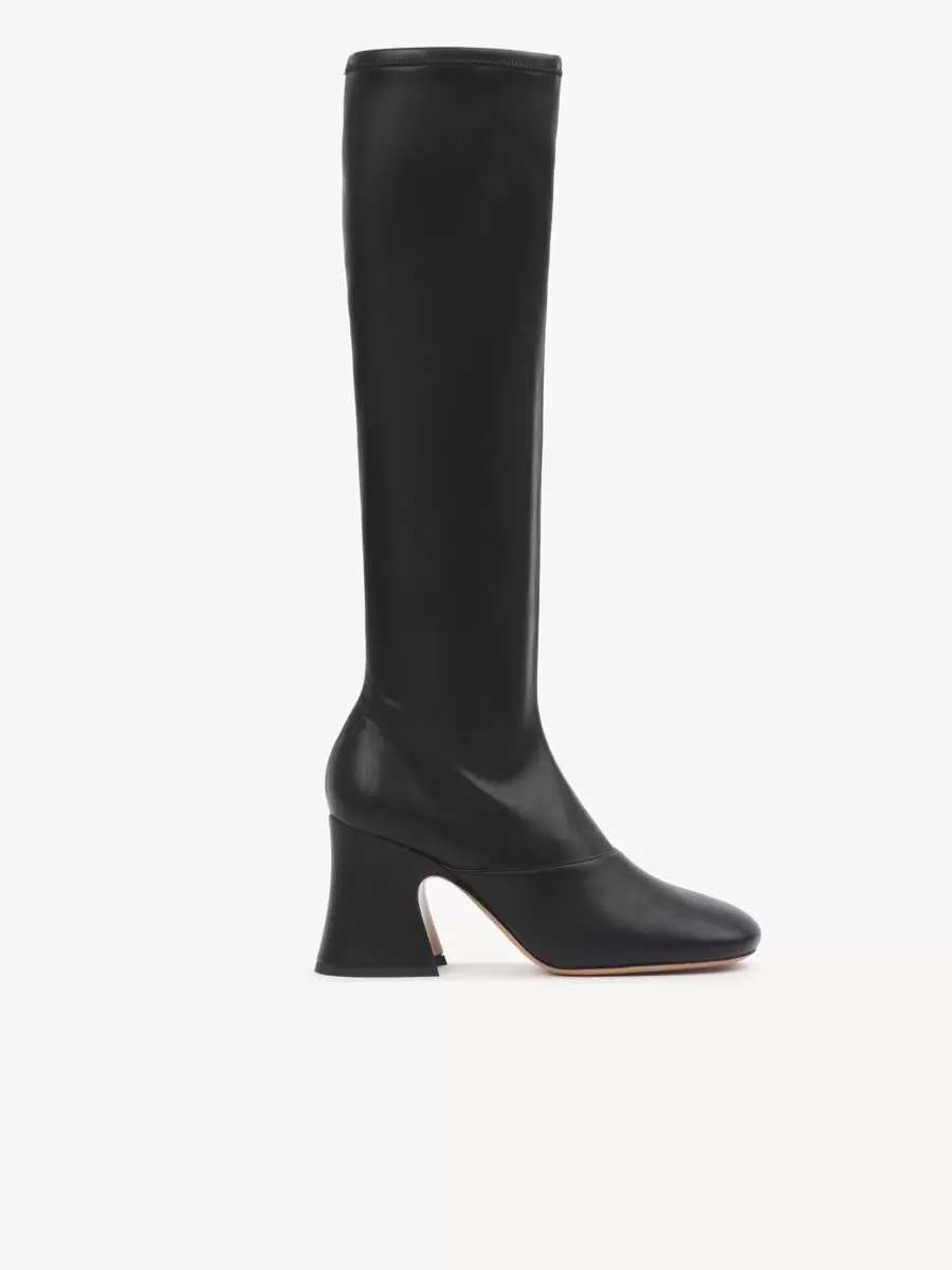 These Janis heeled boots are crafted from soft leather-effect stretch textile for a second-skin fit. Set on a stacked, flared heel, they pair a high tube leg with a subtle square-toe shape.
