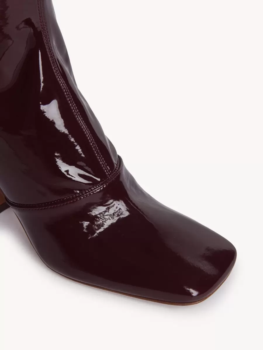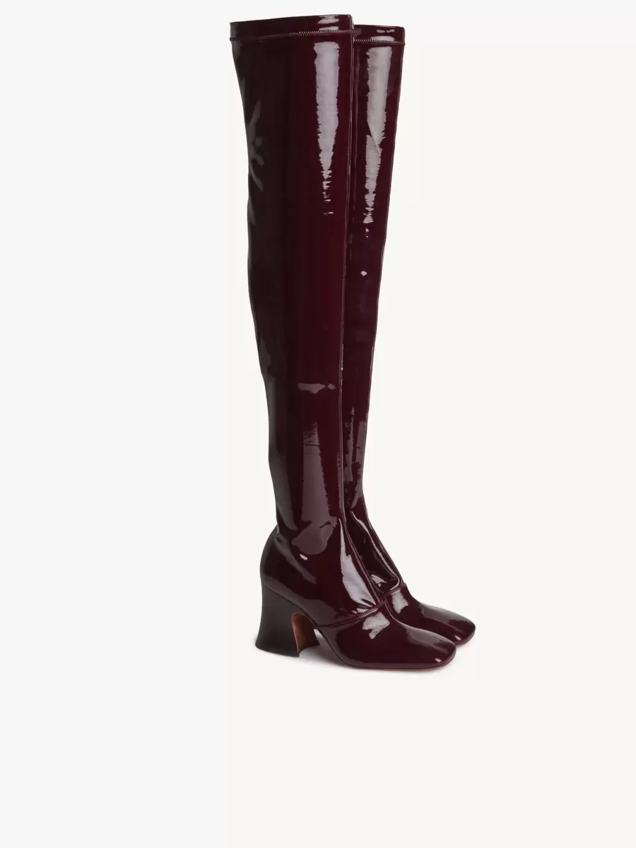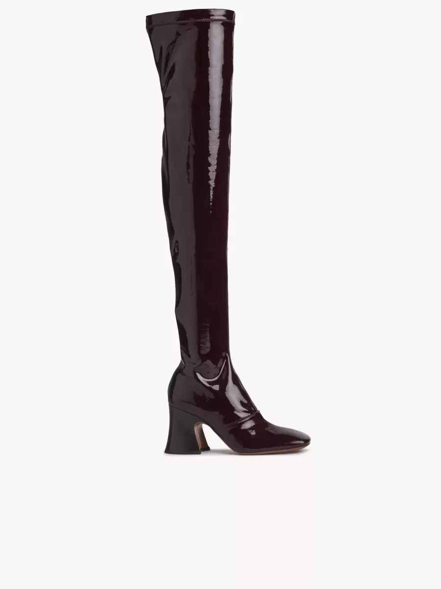 These Janis over-the-knee boots are crafted from patent-effect stretch textile. Set on a contrasting stacked, flared heel, they pair a high tube leg with a subtle square toe shape.