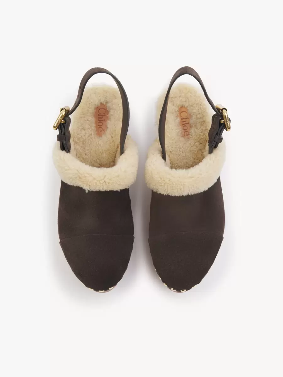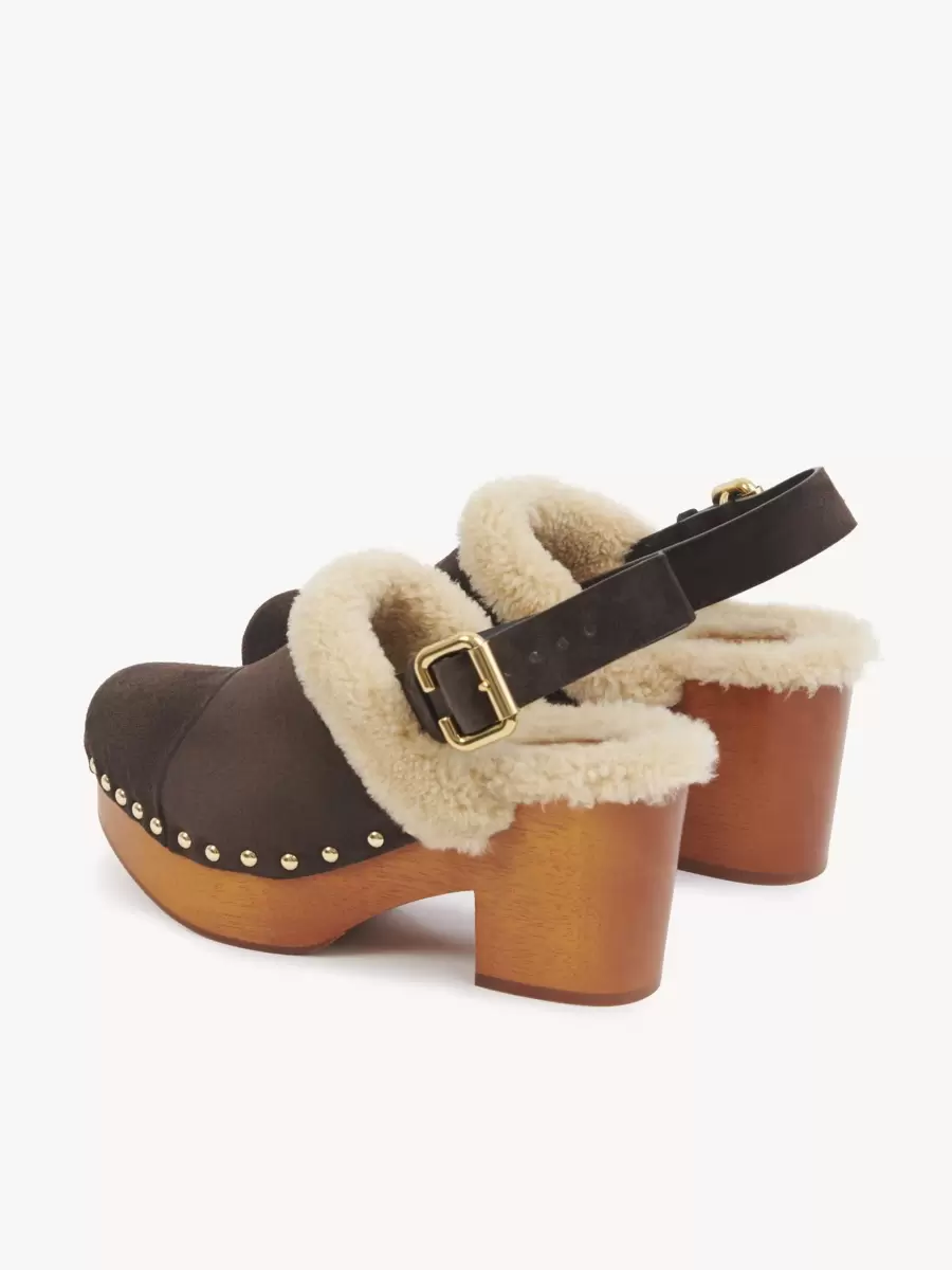 These Jeannette wedge clogs reinterpret an iconic Chloé shape in a lower silhouette. Crafted from a mix of suede calfskin and shearling, they combine an adjustable ankle strap with a chunky wooden wedge platform.