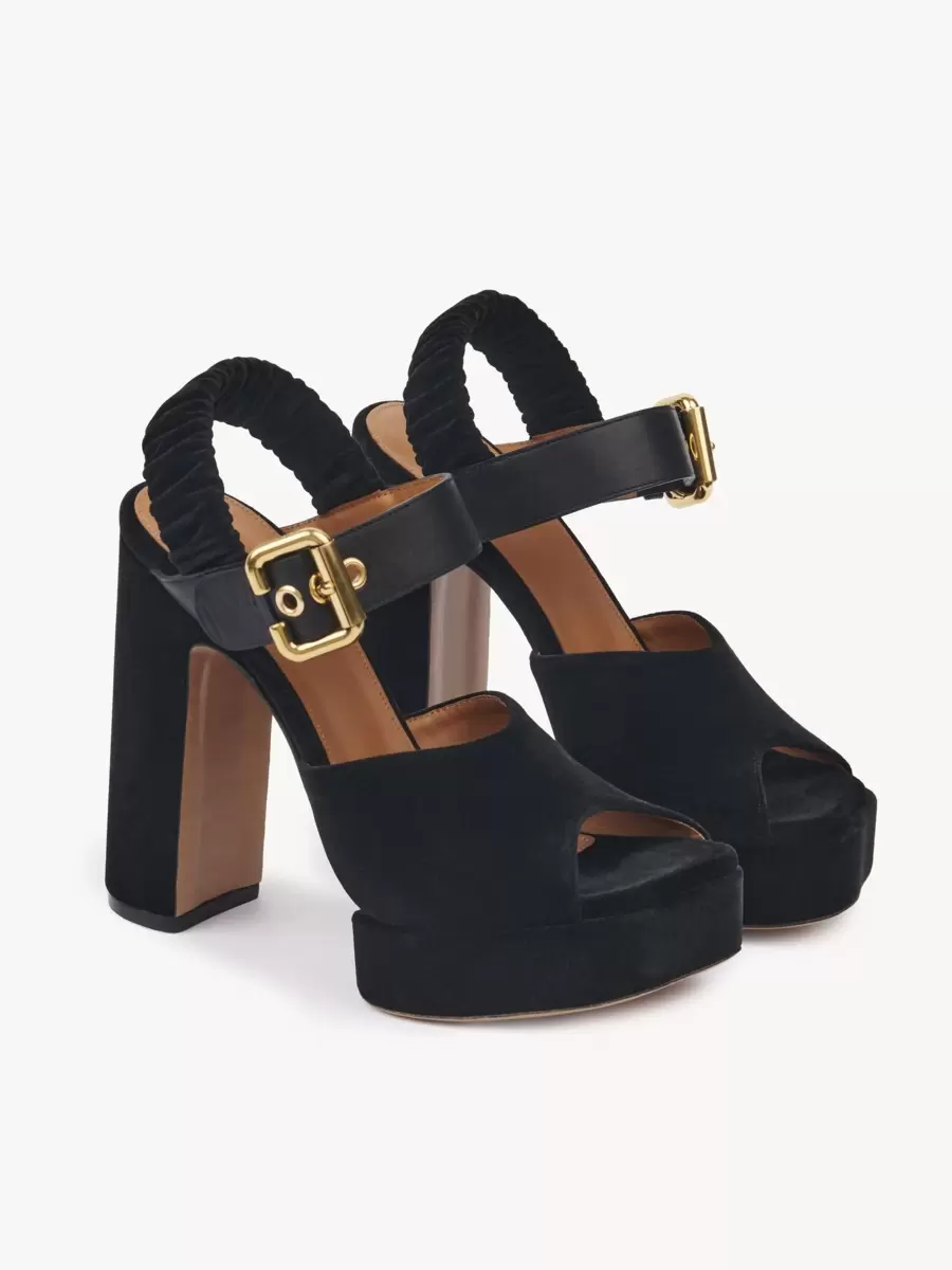 Crafted from velvet and vegetable-tanned calfskin, the Aria platform sandals pair a block heel with a distinctive wavy sole.