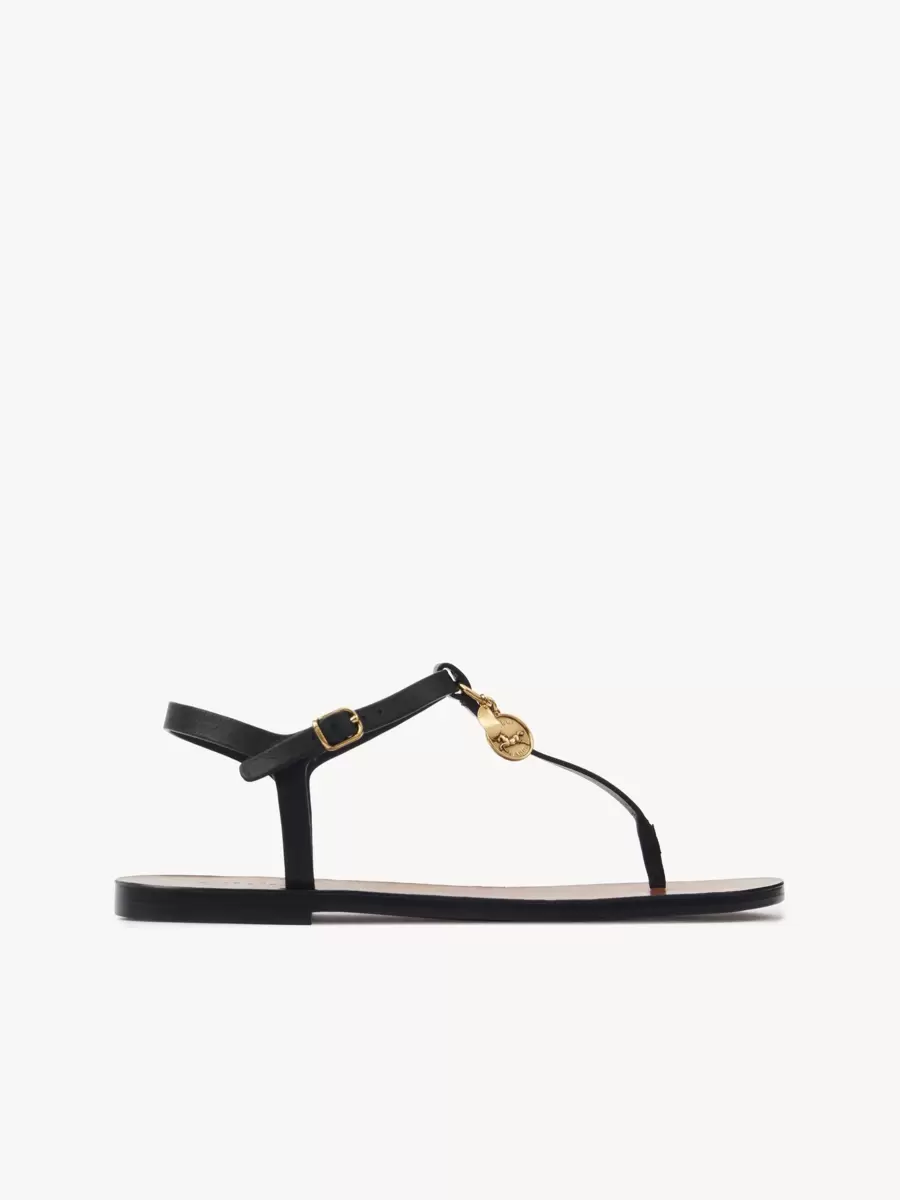Crafted from shiny calfskin, the Chloé Charms flat sandals pair a delicate thong upper with an adjustable buckled ankle strap. The front is embellished with subtle gold-tone charms inspired by the Maison’s heritage.