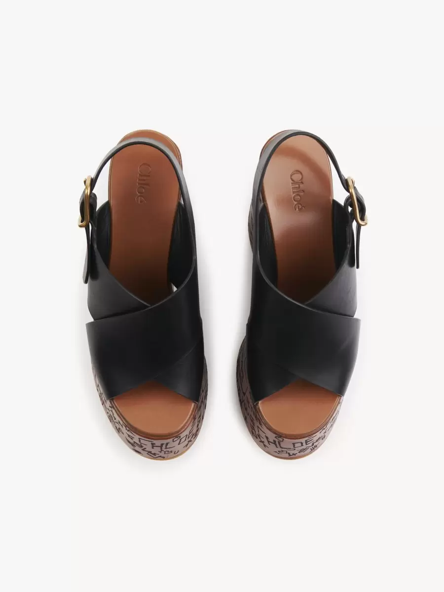 The Maxime wedges feature criss-cross straps in semi-shiny cowhide with a wood-effect platform structure.